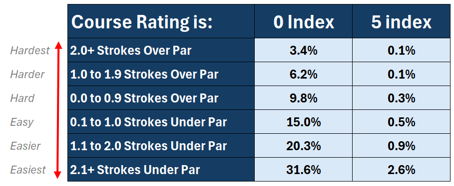 Course difficulty dominates… a scratch player is about 10x more likely to shoot under par on easy courses versus hard ones.